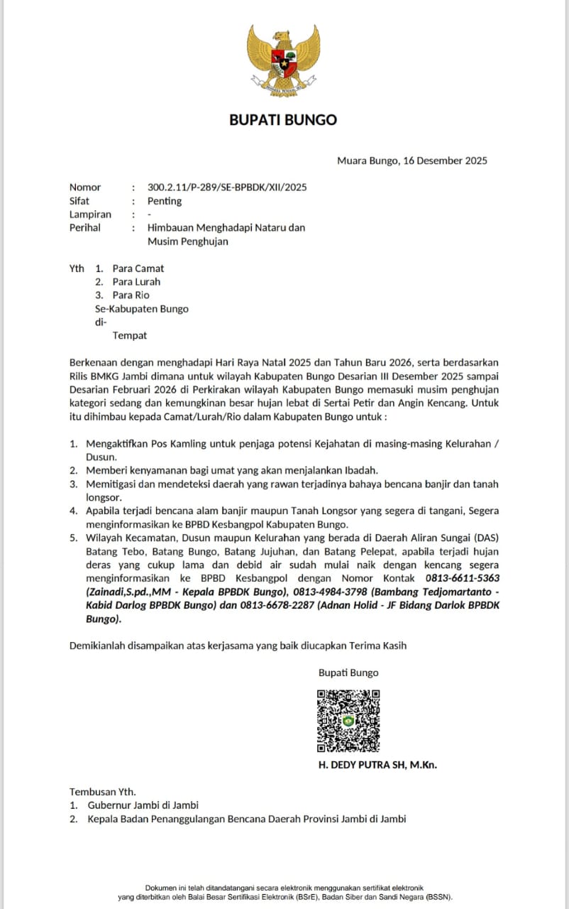 PALUPI NEWS, BUNGO – Bupati Bungo, H. Dedy Putra, SH., M.Kn., mengeluarkan Surat Imbauan Nomor 300.2.11/P-289/SE-BPBDK/XII/2025 tertanggal 16…